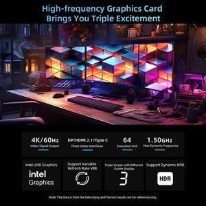 Der Mini-Computer B10 Pro verfügt über eine Intel UHD-Grafikkarte mit einer dynamischen Frequenz von bis zu 1,50 GHz. Er spielt nicht nur 4K-Videos flüssig ab, sondern ermöglicht auch das stabile Ausführen gängiger Spiele mit hohen Bildwiederholraten. Darüber hinaus unterstützt er den gleichzeitigen Anschluss von bis zu drei Monitoren und sorgt so für mehr Abwechslung in Ihrem Alltag.
