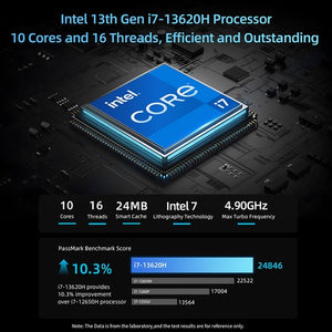 Der B10 Pro Mini-PC überzeugt mit seiner leistungsstarken Hardware. Er ist mit einem Intel Core i7-13620H Prozessor ausgestattet, der über 10 Kerne, 16 Threads und einen Turbo-Boost von bis zu 4,90 GHz verfügt. Dank seiner hohen Multitasking- und Rechenleistung bewältigt er mühelos diverse Büroaufgaben.