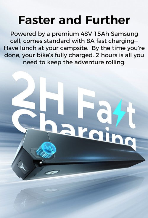 Ausgestattet mit einer hochwertigen 48V 15Ah Samsung-Zelle und serienmäßiger 8A-Schnellladefunktion. Mit einer Reichweite von 130 km können Sie gewundene Waldwege erkunden, felsiges Gelände überqueren und trotzdem noch vor Sonnenuntergang zurückfahren.