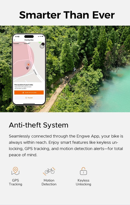 Dank der nahtlosen Verbindung über die Engwe App ist Ihr Fahrrad immer griffbereit. Genießen Sie smarte Funktionen wie schlüsselloses Entriegeln, GPS-Tracking und Bewegungserkennung – für absolute Sicherheit.