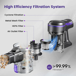 Ein hochdichter Lithium-Ionen-Akku mit 2.500 mAh und 6 Zellen liefert bis zu 45 Minuten konstante Leistung im Eco-Modus, 30 Minuten im Mid-Modus und 15 Minuten im Max-Modus und deckt mit einer einzigen 4-stündigen Aufladung die Reinigung von Wohnungen, Treppen und des ganzen Hauses ab.