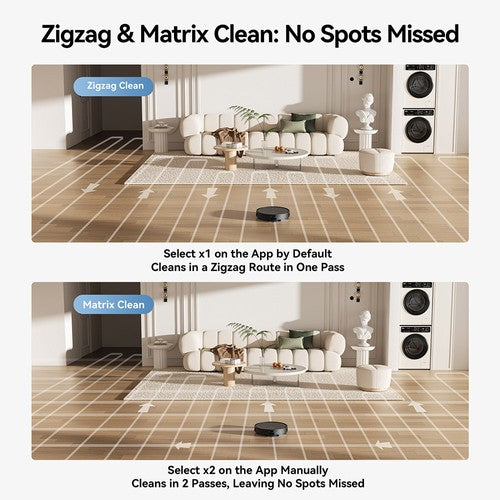 Mit Zigzag & Matrix Clean und einem 3.200 mAh Akku läuft der Roboter bis zu 200 Minuten und reinigt 230 m² lückenlos. Er kehrt zum Aufladen automatisch zur Ladestation zurück und setzt die Reinigung dort fort, wo er aufgehört hat.