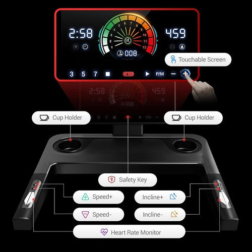 Dieses klappbare Laufband ist mit Herzfrequenzsensoren und Schnellsteuerungstasten an den Handläufen ausgestattet. Berühren Sie während des Trainings einfach die Sensoren an den Handläufen, und Ihre Daten werden in Echtzeit auf dem LED-Display angezeigt. Geschwindigkeitsanpassung, Start und Stopp sind bequem an den linken und rechten Handläufen bedienbar, sodass Sie das Laufband steuern können, ohne den Blick vom Bildschirm abzuwenden. Dieses praktische Design unterstützt Ihren Trainingsrhythmus und sorgt für ein sichereres, effizienteres und flüssigeres Workout.