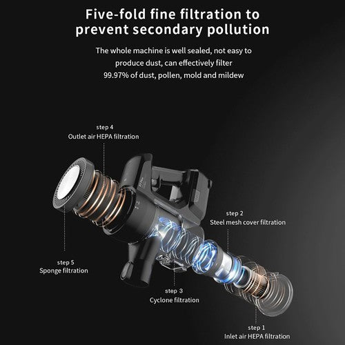 Mit seinem 5-stufigen Filtersystem kann dieser Staubsauger Staub und Partikel unterschiedlicher Größe effektiv trennen. Der mehrstufige Filterprozess beginnt mit dem Primärfilter, der grobe Partikel auffängt, und durchläuft dann eine Reihe feinerer Filter, die kleinste Staubpartikel einfangen und so für saubere und frische Luft sorgen. Diese fortschrittliche Staubabscheidetechnologie verbessert nicht nur die Reinigungseffizienz, sondern trägt auch zur Verbesserung der Luftqualität in Ihrem Zuhause bei.